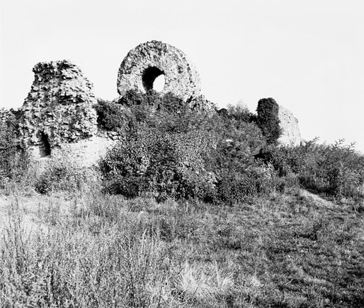 Vue du donjon renversé au centre, du mur d'un petit logis à gauche, mur tardif du château en haut à droite.