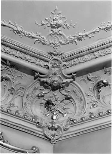 Premier étage, petit salon, plafond avec stucs : trophée d'instruments de musique.