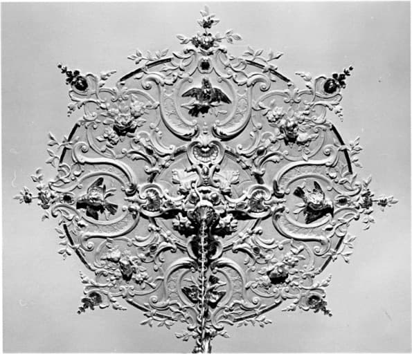 Premier étage, petit salon, plafond : rosace en stuc au centre.
