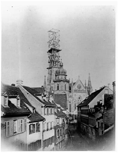 Vue du nouveau temple, avant la destruction du clocher de l'ancienne église, prise depuis la rue Henriette.