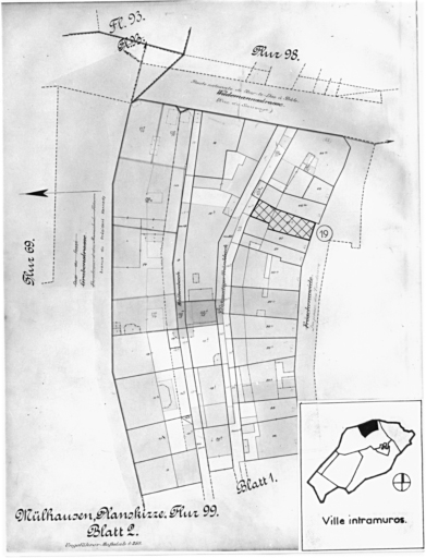 Plan cadastral de 1905, avec la situation des édifices inventoriés. Extrait de la section 99, feuille 2 : maison, 19 impasse des Tondeurs.