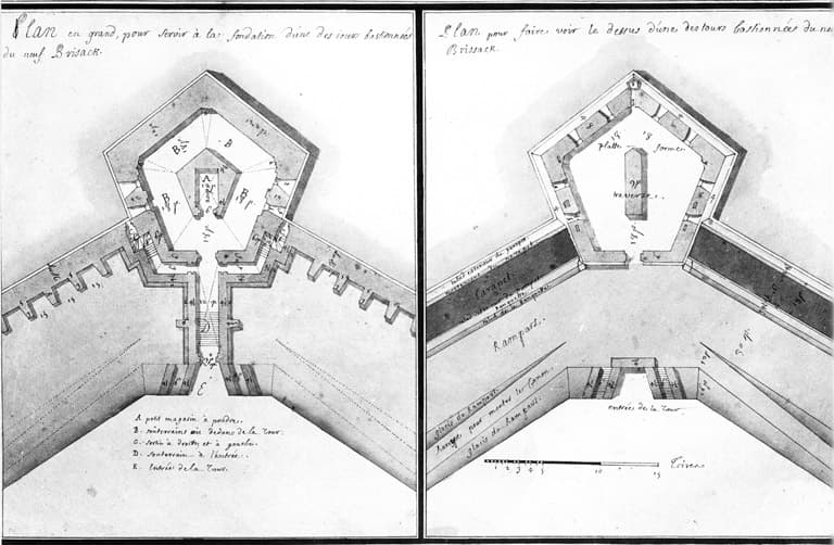 Plan pour la fondation d'une des tours bastionnée. Plan pour faire voir le dessus d'une des tours bastionnée.
