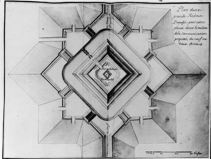 Plan d'une grande Redoute proposée pour estre placée dans le milieu de la communication projectée, du neuf au vieux Brisack.
