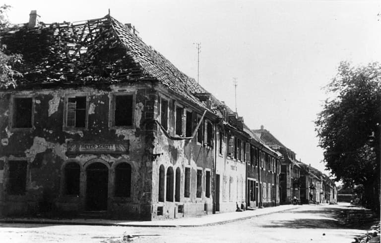 Immeuble Meyer-Schott, à l'angle de la place d'Armes et de la place de la Mairie (1946).