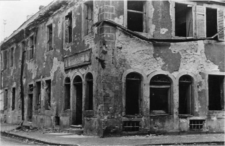 Immeuble Meyer-Schott, à l'angle de la place d'Armes et de la place de la Mairie (1946).
