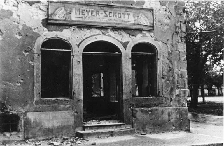 Immeuble Meyer-Schott, à l'angle de la place d'Armes et de la place de la Mairie ; entrée surmontée de l'enseigne (après 1945).
