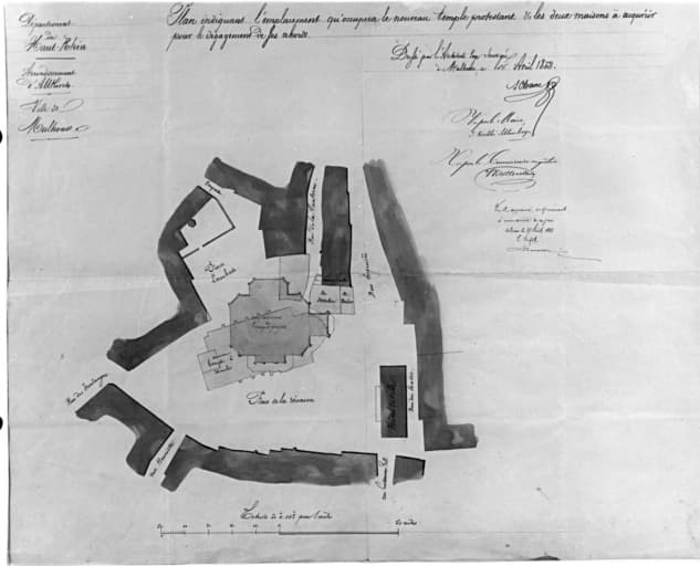 Reconstruction du temple : plan indiquant l'emplacement qu'occupera le nouveau temple protestant et les deux maisons à acquérir pour le dégagement des abords.
