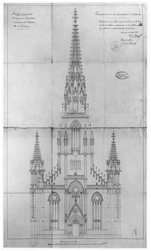 Projet de reconstruction du temple protestant. Construction d'une flèche en pierre à élever sur la tour au lieu d'une flèche en charpente et d'une flèche en pierre sur chacune des quatre tourelles des escaliers.