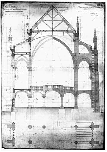 Reconstruction du temple protestant. Coupes et élévations transversales de la nef et les bas-côtés sur le milieu d'une travée, sur l'axe des colonnes et contre-forts. Plans, coupes et élévations d'après l'exécution.