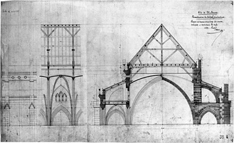 Reconstruction du temple : coupes en travers et en long des voûtes. Contreforts et couverture des nefs.