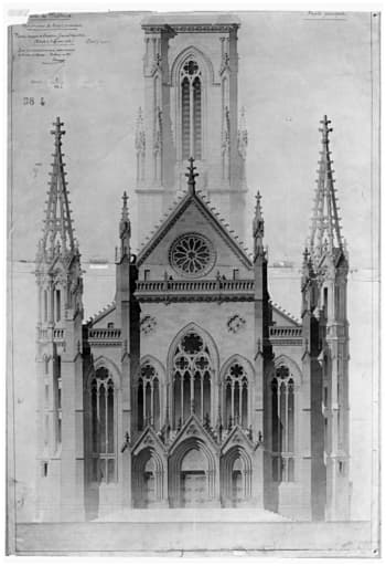 Plans, coupes et élévations d'après l'exécution. Façade principale.