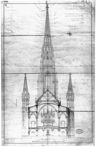 Reconstruction du temple protestant. Coupe transversale et élévation.
