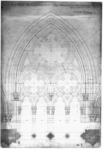 Reconstruction du temple protestant. Détail des chapiteaux, rosaces et archivoltes de la grande fenêtre principale.