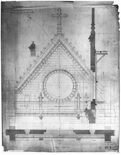Reconstruction du temple protestant. Détails du pignon, façade principale.