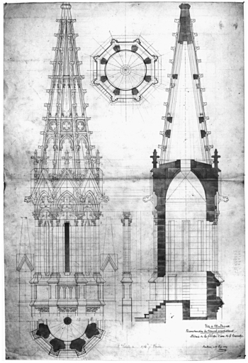Reconstruction du temple protestant. Détail de la flèche d'une des 4 tourelles.