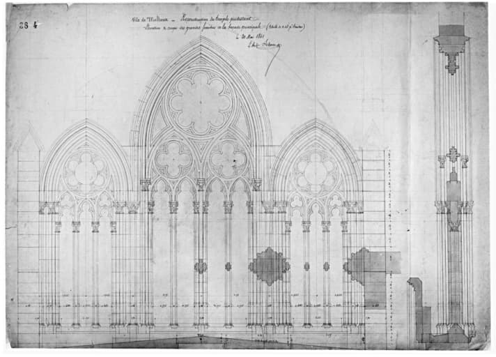 Reconstruction du temple protestant. Elévation et coupe des grandes fenêtres de la façade principale.