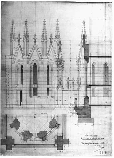 Reconstruction du temple protestant. Plateforme et flèche du clocher (plan, coupe, élévation).