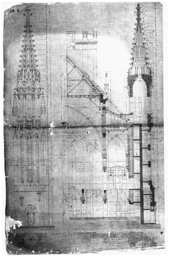 Plan, coupe, élévation d'une tourelle d'escalier et de la nef.