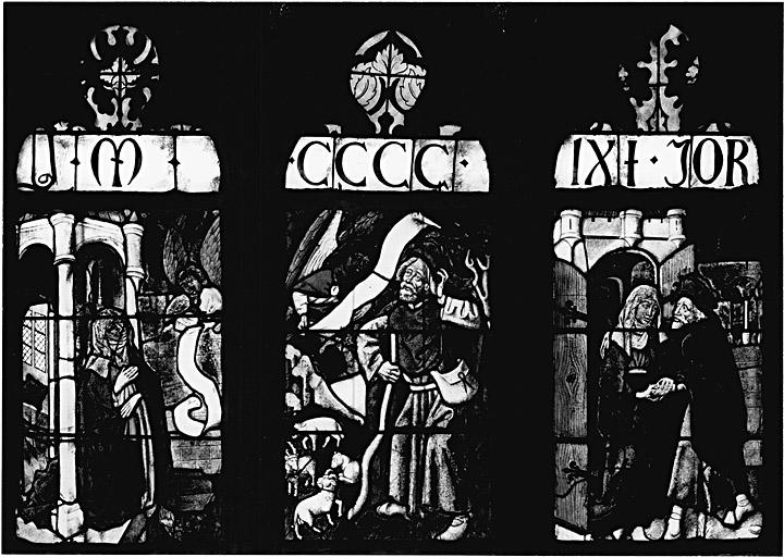 Vue des panneaux 7a, b, c et têtes de lancettes. Annonces à Sainte Anne, à Joachim, Rencontre à la Porte dorée et date.