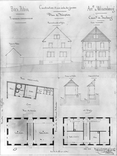 Plans du rez-de-chaussée et de l'étage, coupe transversale et élévation de la façade sur rue.