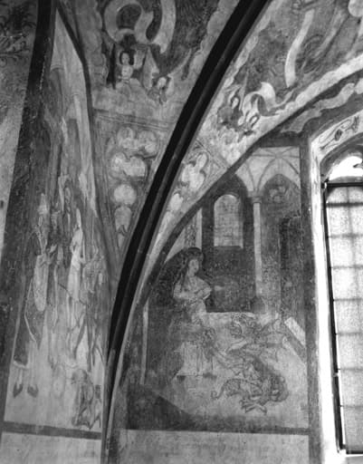 Vue de l'angle sud-est du choeur. Quatrième scène de la vie de sainte Marguerite : Marguerite tue le dragon en le bénissant.