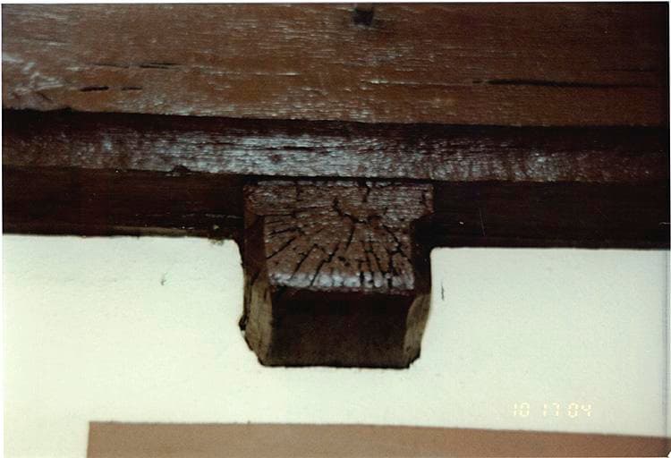 Détail de la sablière et d'une solive portant l'encorbellment du 1er étage.