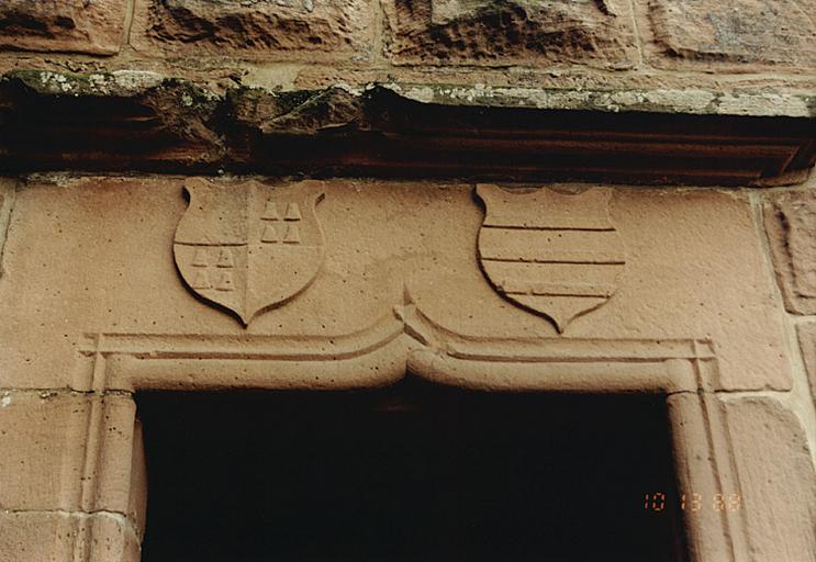 Porte d'entrée, dans la face est, de la tour d'escalier : détail à droite armes de Frédéric de Fleckenstein (décédé en 1559), à gauche des armes de sa deuxième femme, Catherine de Cronberg, épousée en 1537.