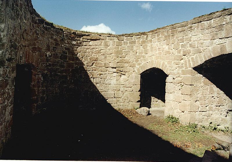 Vue de l'intérieur de la barbacane du 16e siècle, avec canonnières et porte à pont-levis nord.