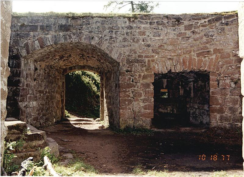 Vue de l'intérieur de la barbacane du 16e siècle, avec porte à pont-levis et canonnière sud.