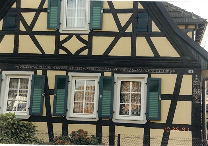 Vue du logis de ferme de 1791,138, rue Principale, avec sablière à inscription propitiatoire et patriotique.