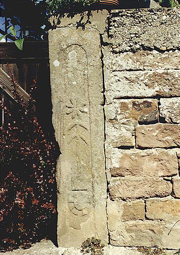 Vue de la ferme, 48 rue de l'Eglise, piédroit de la porte charretière, sculpté d'une roue et d'une fleur.