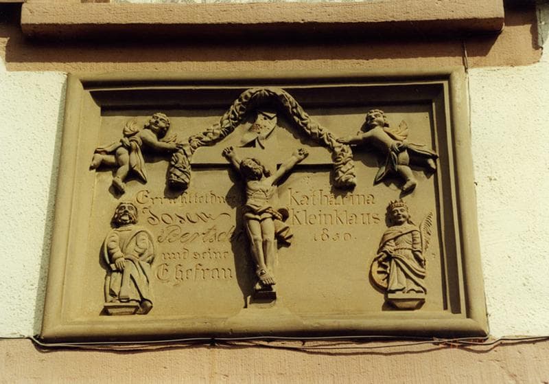 Ferme, 43 rue des Seigneurs : relief daté 1850, représentant le Christ en croix, saint Joseph et sainte Catherine.