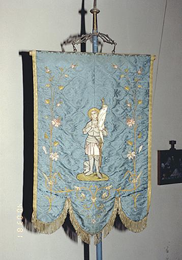 Bannière No 1 (d'un ensemble de 2), de l'Enfant Jésus et de Jeanne d'Arc : vue d'ensemble du côté figurant Jeanne d'Arc.
