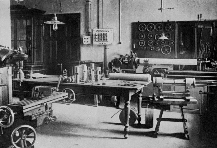 Vue de l'atelier de l'Institut de Physique en 1924 : couvercles d'électrodynamomètres sur la table (au centre).