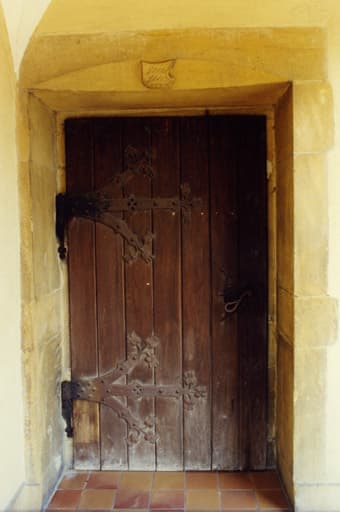 Vue de la porte latérale. Un remploi de l'ancienne église : chambranle et linteau sculpté aux armoiries des Wurtemberg.