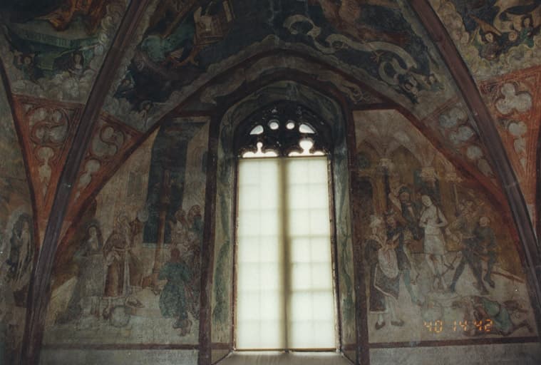 Vue d'ensemble du mur est du choeur. Deuxième et troisième scènes de la vie de sainte Marguerite : Olibrius montre l'idole à Marguerite : Marguerite est fouettée.