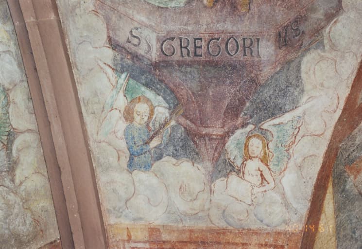 Vue partielle du voûtain nord-est. Détail des anges musiciens sous la console de saint Grégoire le Grand.