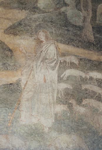 Vue partielle du mur nord du choeur. Première scène de la vie de sainte Marguerite : détail de Marguerite.