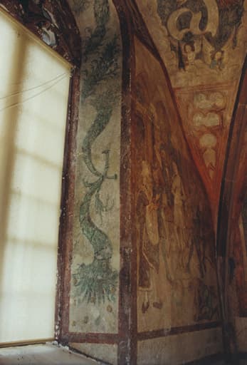 Vue partielle de l'ébrasement de la baie est du choeur. Cornes d'abondance et palmes.