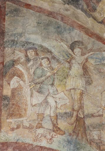Vue partielle du mur ouest. Septième scène de la vie de sainte Marguerite : détail : Marguerite est brûlée à l'aide de torches.