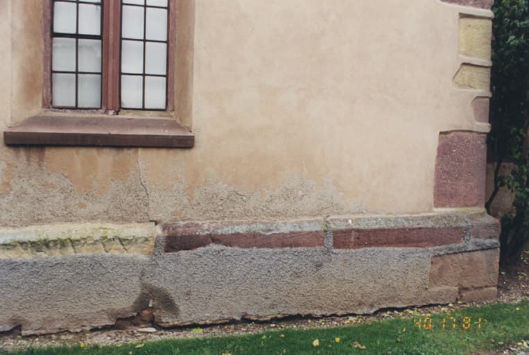 Vue de la façade est. Le solin de la tour et l'inscription remployée.