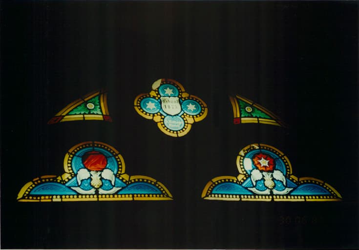 Imposte de la porte : marque du verrier J. Röttinger, 1875. Vue de détail.