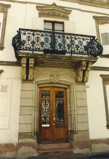 Vue de détail de la porte d'entrée avec linteau surmontée d'un balcon soutenu par 2 paires de consoles ouvragées.