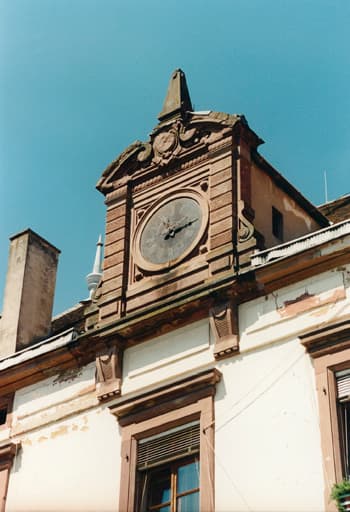 Vue de détail d'une fausse lucarne avec horloge, située dans la face sud (au centre) de la toiture du pavillon des officiers.