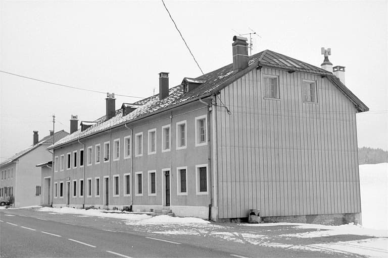 Logement d'ouvriers vu de trois quarts droit, en hiver.