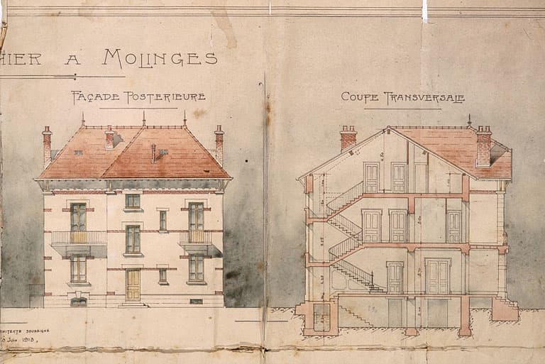 Villa L.N. Gauthier à Molinges [détails : façade postérieure et coupe].
