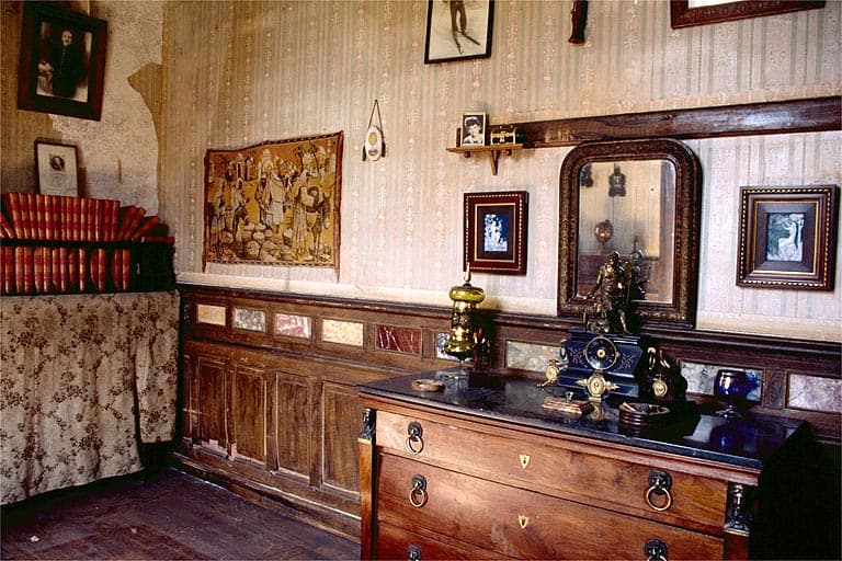 Bureau : échantillons de marbre intégrés dans le lambris d'appui.