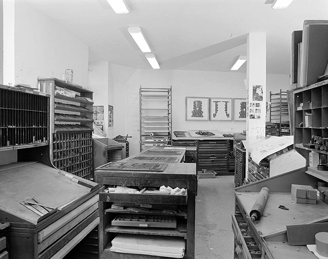 Salle de composition froide : rangs et rangs à pupitre, lingotiers et interligniers, marbres.
