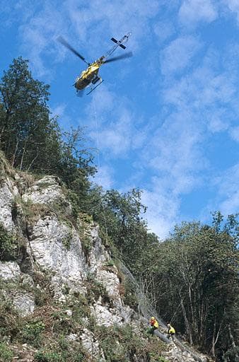 Sécurisation de paroi rocheuse à Syam : ancrage des rouleaux de filets de protection.