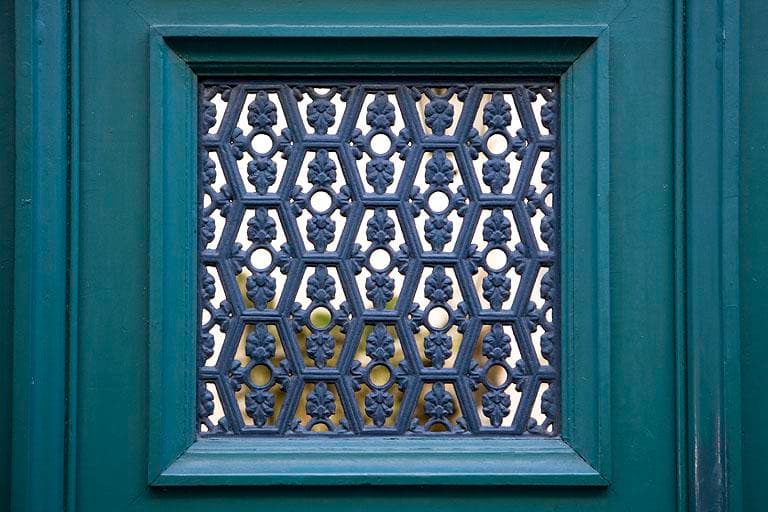 Portail d'entrée : détail du décor en fonte d'un vantail de la porte.